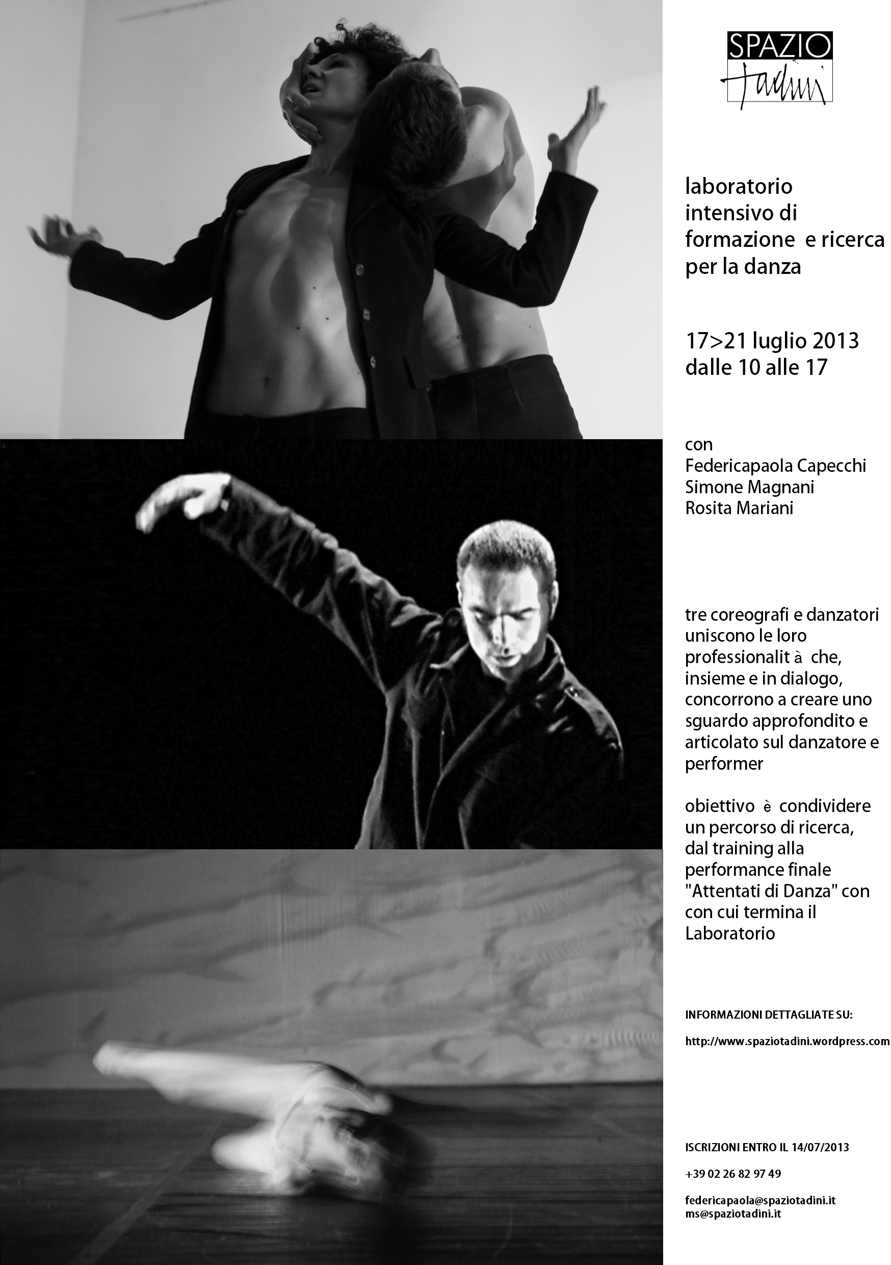 La danza, come sempre, è di casa a Spazio Tadini. Mentre lavoriamo alla nuova edizione – la V° – di Coreografia d’Arte Festival, riprendono una serie di appuntamenti – da qui a luglio – legati alla danza sia nei suoi aspetti professionali che nei suoi aspetti più ludici e di divertimento. Sia momenti spettacolo che workshop, corsi e laboratori, ma anche eventi (tavoli, conferenze, presentazioni, performance, etc). Ripartono i CORSI di Contact, Physical Theatre, Danza e Movimento per tutti. Le lezioni di prova gratuite sono: domenica 11 (mattina/pomeriggio), martedì 13 (19:30/22:30), domenica 18 (mattina/pomeriggio), mercoledì 21 (19:30/22:30) gennaio 2015. Per chi desidera partecipare ad una lezione prova deve mandare una email di prenotazione a federicapaola@spaziotadini.it indicando nome, cognome, numero di telefono con scelta del giorno e conferma di adesione. Continua la lettura di Danza: Corsi da Gennaio a Luglio 2015